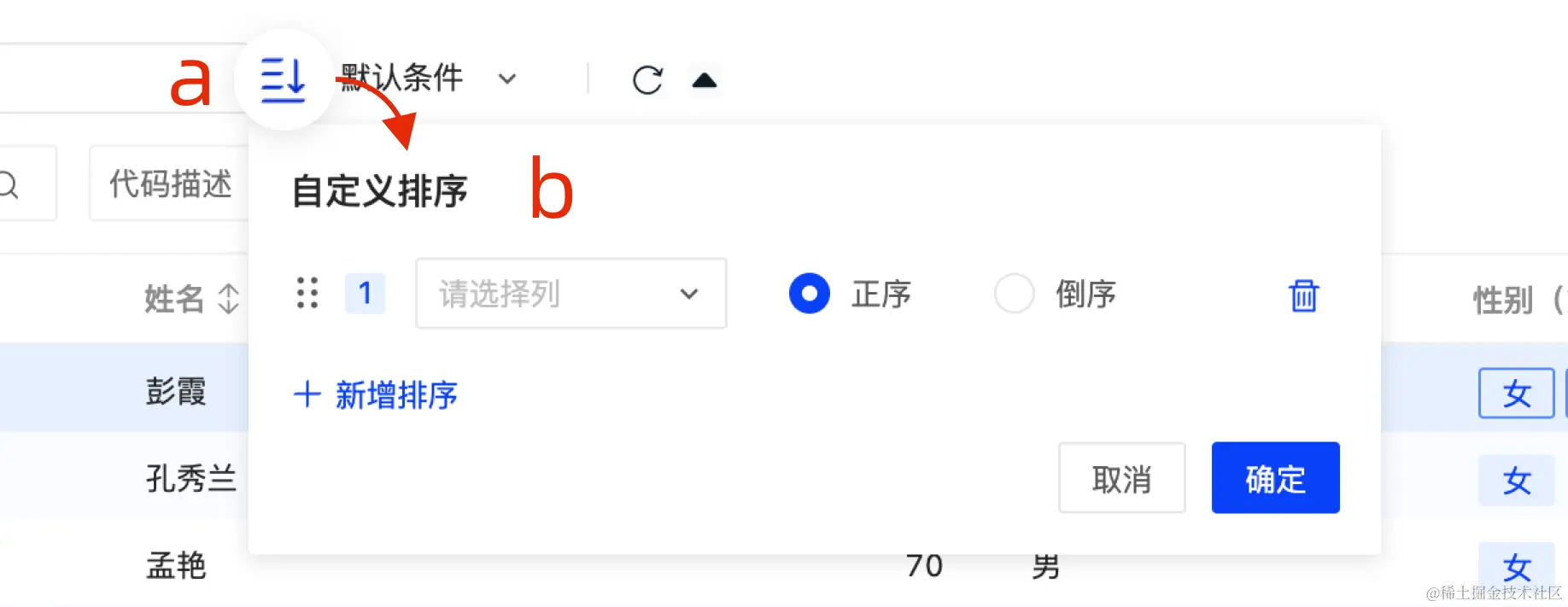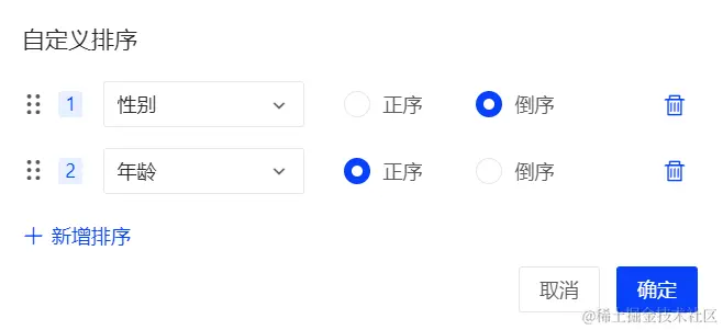 点击表头的多列排序图标会弹出一个窗口,您可以在窗口中控制多个列字段的顺序和排序方式。