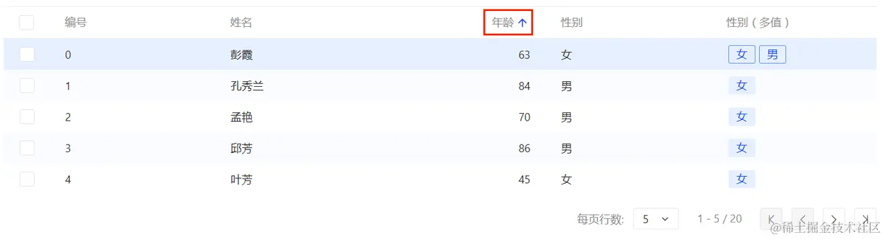 Tips: 年龄正序按数字从小到大;性别倒序按照拼音顺序倒序,女 -> 男