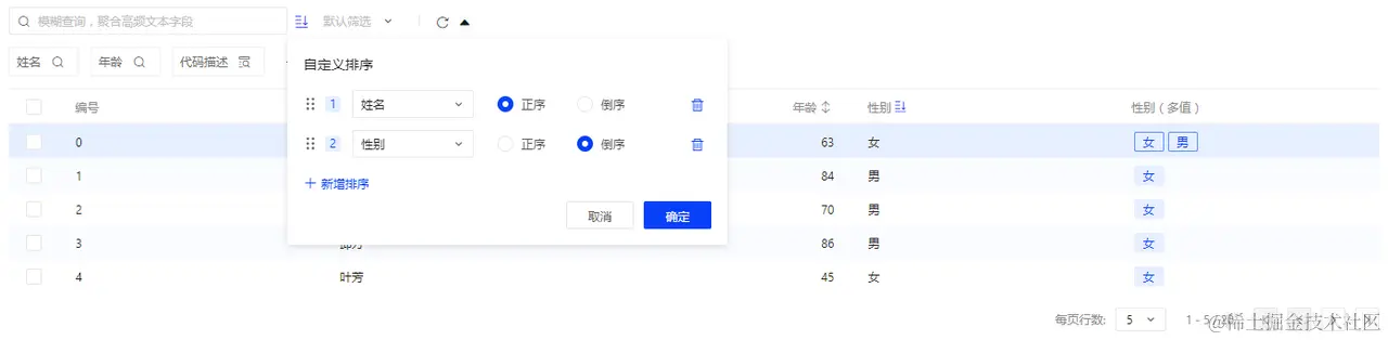 具体而言,点击列头将触发单列排序;点击多列排序弹窗确认后,会清除单列排序根据弹窗内配置触发多列排序,反之亦然。