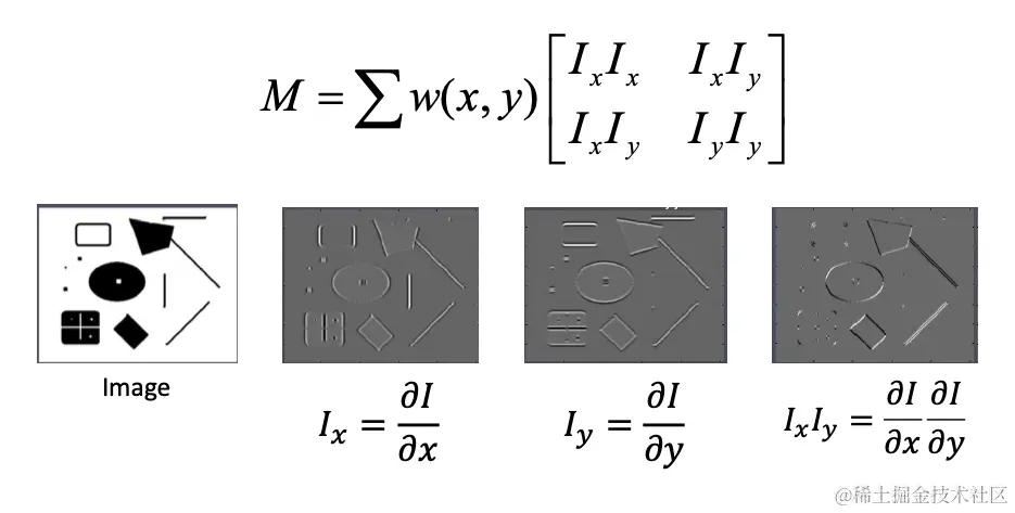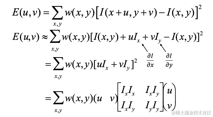 和 分别是图像强度函数关于 ( x ) 和 ( y ) 的偏导数。 其中,W 是图像的一个小窗口, 和 是图像强度函数在 x 和 y 方向的梯度。 代表在特定点上 和 的乘积。