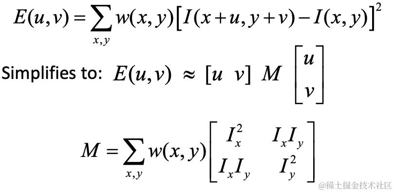 使用泰勒级数来近似移动后的强度,并用矩阵 M 替代,有助于有效地确定图像中的角点位置。