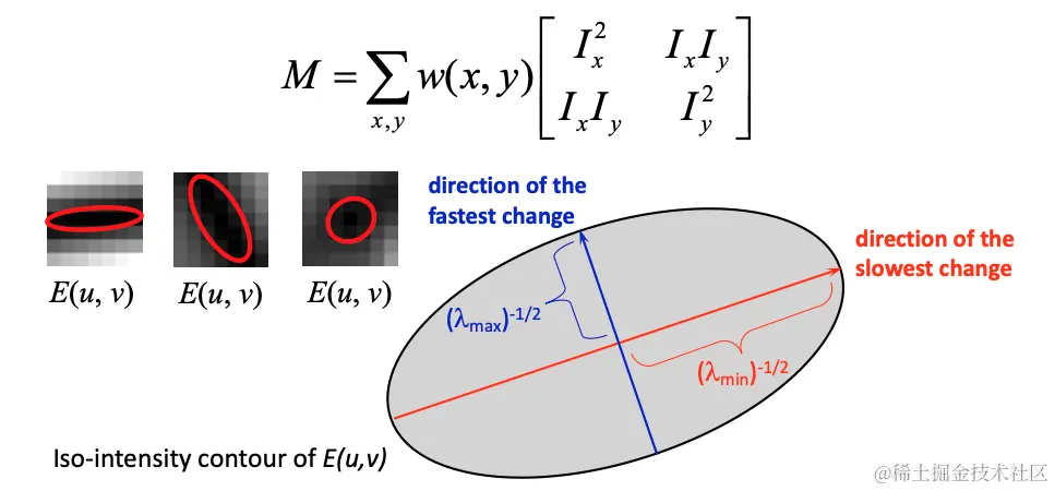 使用矩阵 M 的特征值(eigenvalues) 来检测角。