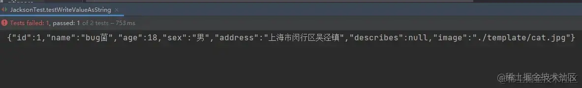 String json = ""{"id":1,"name":"bug菌","age":18,"sex":"男","address":"上海市闵行区吴泾镇","describes":null,"image":"./template/cat.jpg"}";