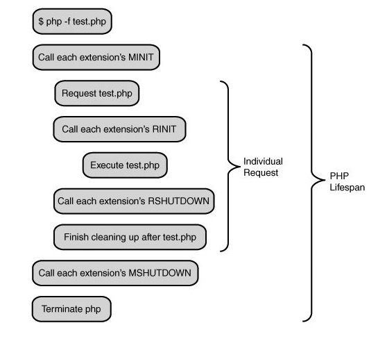 从请求放宽到整个 PHP 的执行阶段,在上面请求的处理前后,增加模块的初始化和关闭阶段: