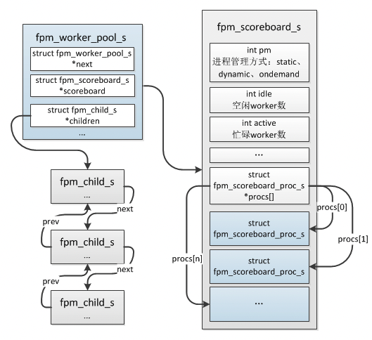 关系类似:fpm_worker_pool_s(fpm_scoreboard_s(fpm_scoreboard_proc_s))