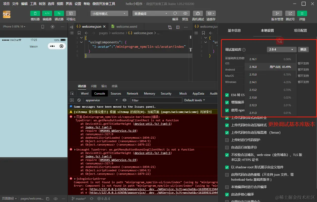 TypeError: wx.getMenuButtonBoundingClientRect is not a function问题分析:这个 api是 更高版本版本支持的,你的用户有的客户端基础库版本 小于这个基础库。你在小程序后台设置下 最低基础库2.1.0.那样用户客户端基础库版本低于此就会提示升级