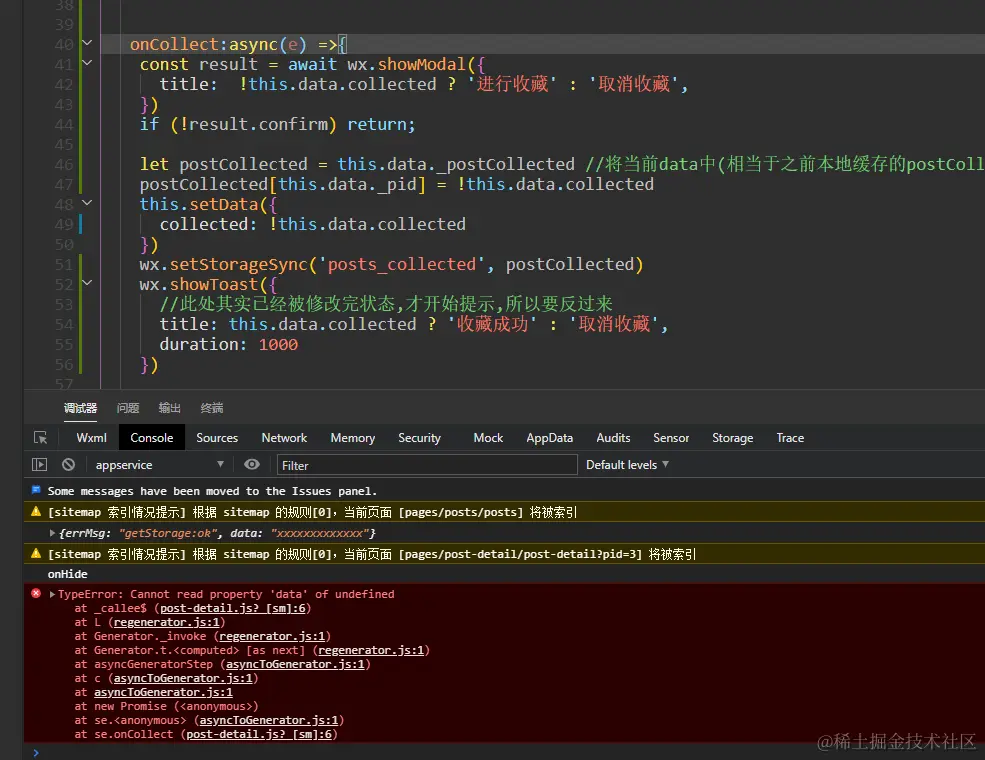 async onCollect(e) { const result = await wx.showModal({ title: !this.data.collected ? '进行收藏' : '取消收藏', }) if (!result.confirm) return; let postCollected = this.data._postCollected //将当前data中(相当于之前本地缓存的postCollected)拉去下来,防止被覆盖 postCollected[this.data._pid] = !this.data.collected this.setData({ collected: !this.data.collected }) wx.setStorageSync('posts_collected', postCollected) wx.showToast({ //此处其实已经被修改完状态,才开始提示,所以要反过来 title: this.data.collected ? '收藏成功' : '取消收藏', duration: 1000 }) },使用箭头函数,但需要保存this指向