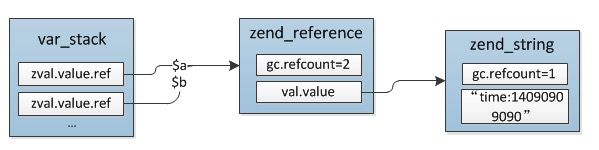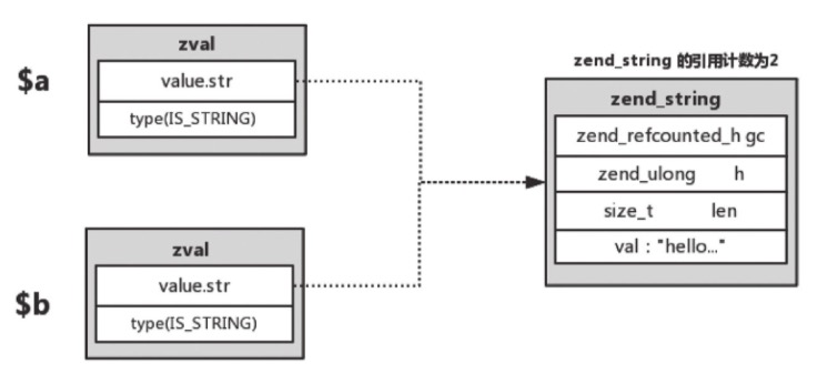 $b = $a; //$a,$b -> zend_string_1(refcount=2)