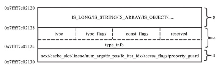zval 中 u1 和 u2 都是联合体,联合体特点是内部给字段复用存储空间,故 v 和 type_info 是共享一块空间的,v 和 type_info 的关系:
