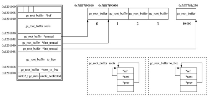 - 扫描 roots 环,将 gc_info 颜色为黑色的元素从 roots 移除。然后对 roots 中颜色为白色的元素进行深度优先遍历,将其引用计数加 1(在第一步有减 1 操作),然后将 roots 链表移动到待释放的列表中(to_free)。
