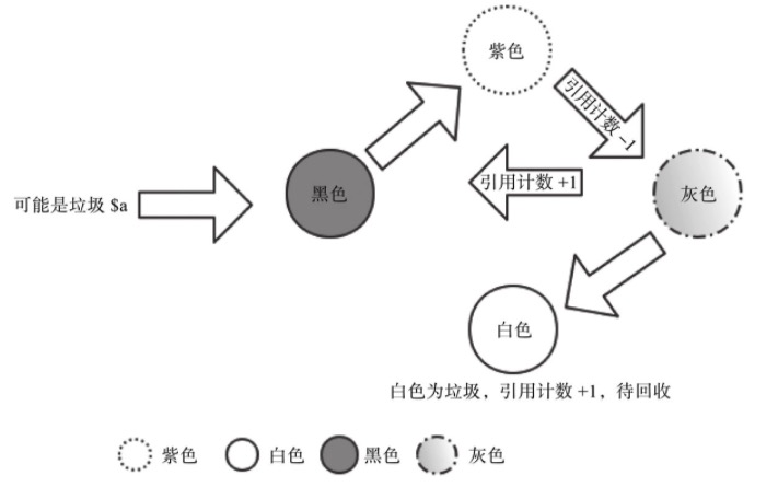 - 对 roots 环(即新加入的有可能是垃圾的变量)中每个元素进行深度优先遍历,将每个元素中 gc_info 为紫色的标记元素为灰色,且引用计数减 1。