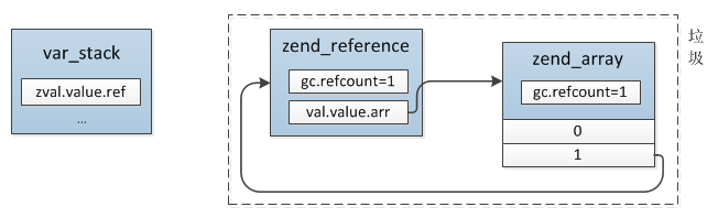 此时该数值外部已经没有指向的变量,导致数组无法访问到。这种情况只可能发生在数组或对象中,所以 PHP 会针对这两种类型做特殊检查:如果当销毁一个变量后,发现引用计数还大于0,并且是IS_ARRAY 、IS_OBJECT时,则此 value 则会被放入 gc 的垃圾链表中,等待链表达到一定数量后会启动检查回收掉。