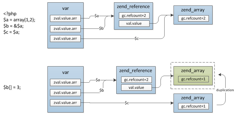 // 此时老的zend_value的refcount依旧是2,因为有a和新的bc的reference两个指向。