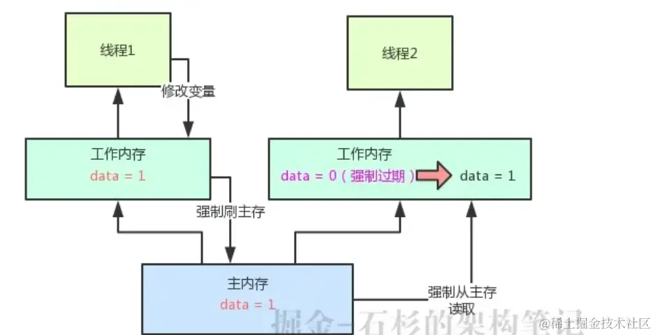 接着强制过期其他线程的本地工作内存中的缓存,最后其他线程读取变量值的时候,强制重新从主内存来加载最新的值!