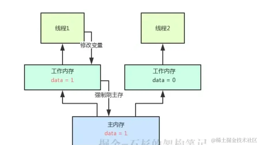 比如线程一修改了data变量的值为1,然后将这个修改写入自己的本地工作内存,此时线程1的工作内存里的data变量为1,但是线程2的工作内存和主内存data值还是0.