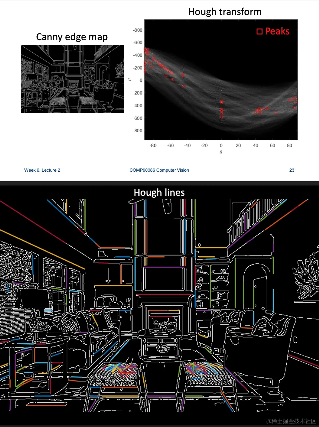 因此,通过在霍夫空间中寻找峰值,我们可以确定图像中存在的直线及其参数。每一个峰值都对应于图像中的一个或多个直线。这些峰值的高度(即票数)可以用于过滤出强烈支持的直线,并舍去只是由噪声或其他不相关因素导致的假阳性直线。