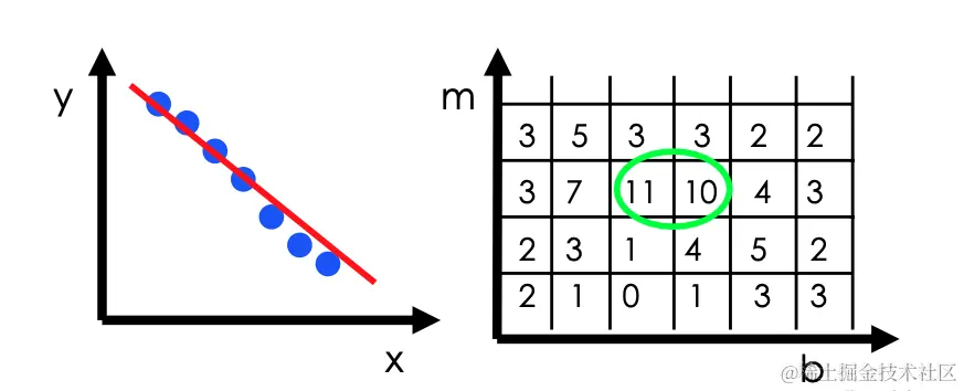 - 如果点的位置没有噪声,那么识别得票最多的参数是容易的。