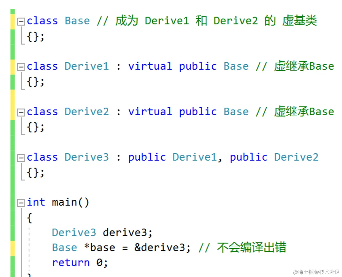 但这时 Rec 仍不能被实例化,因为它没有实现继承来的 volume() 函数,volume() 仍然是纯虚函数,所以 Rec 也仍然是抽象类。直到 Cuboid 类,才实现了 volume() 函数,才是一个完整的类,才可以被实例化。可以发现,Line 类表示“线”,没有面积和体积,但它仍然定义了 area() 和 volume() 两个纯虚函数。