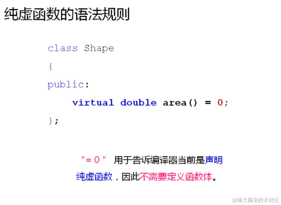纯虚函数没有函数体,只有函数声明,在虚函数声明的结尾加上=0,表明此函数为纯虚函数。