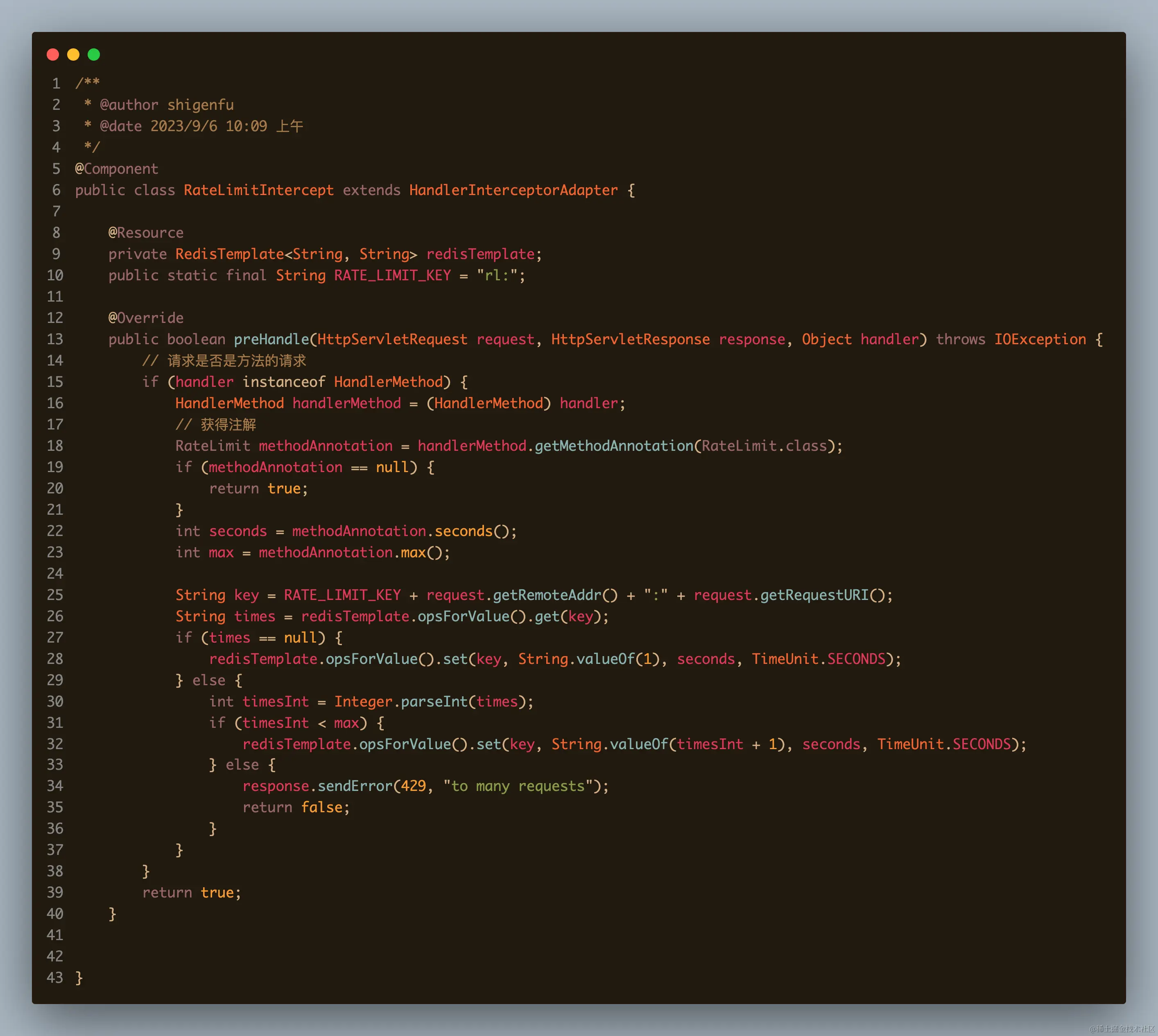 首先用户请求系统的接口,后端会有一个流控的拦截器,这里边主要是去获得请求的信息,用ip+URI作为redis的key,查询在redis中记录的次数,如果次数大于规定的单位时间的访问次数,就认为这是非法的请求了,就需要拦截了。那具体的代码该怎么设计呢》?下边是一份详细的代码案例。亮点在于:shigen使用了一个注解,支持接口的个性化设置。