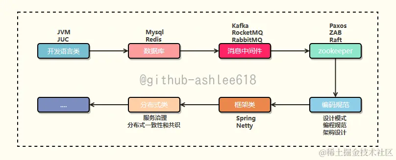 开发语言类->数据库->消息中间件->zookeeper->编码规范->框架类->分布式类->查漏补缺。
