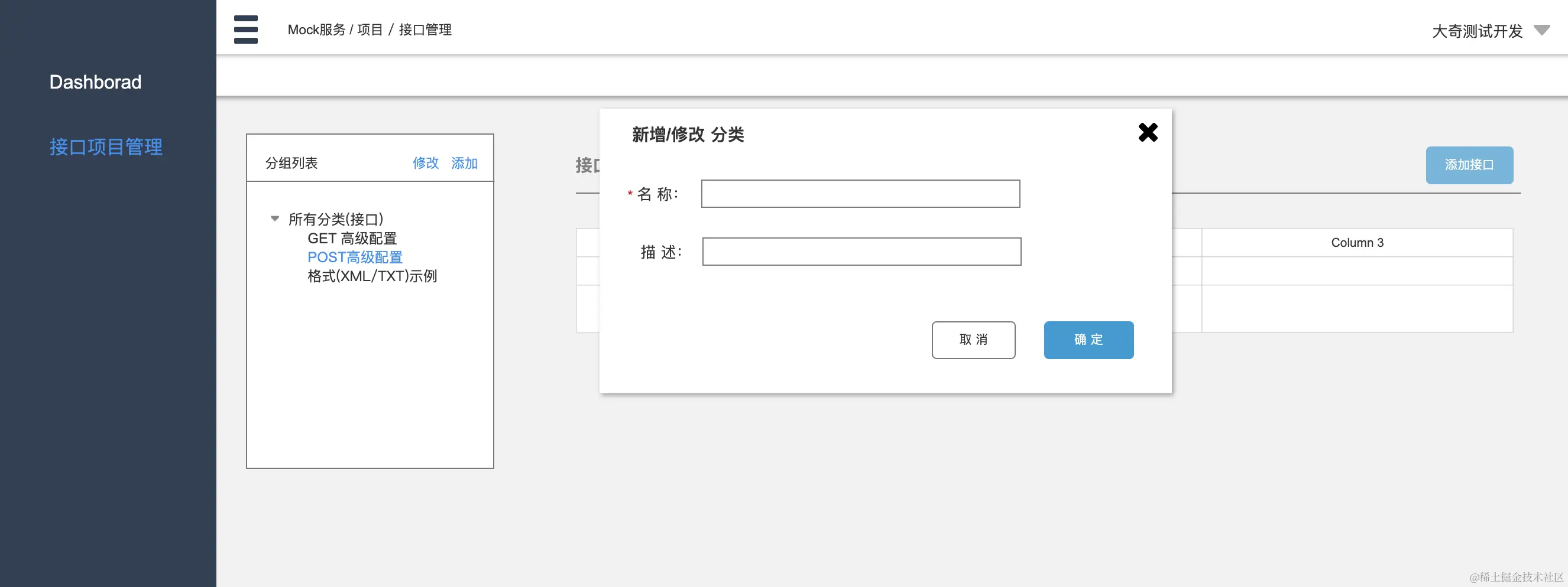 接口的数量可能很多,这里增加一个分类tree功能,可以进行归类和查询,如原型图将其放在项目同页面的最左侧区域,方便直接切换过滤。