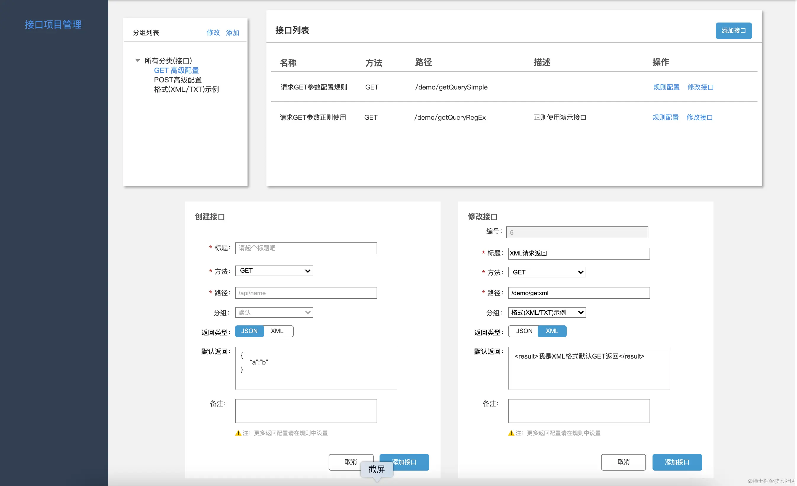 - HTTP返回体:json或者xml,这个根据接口配置的返回类型设定