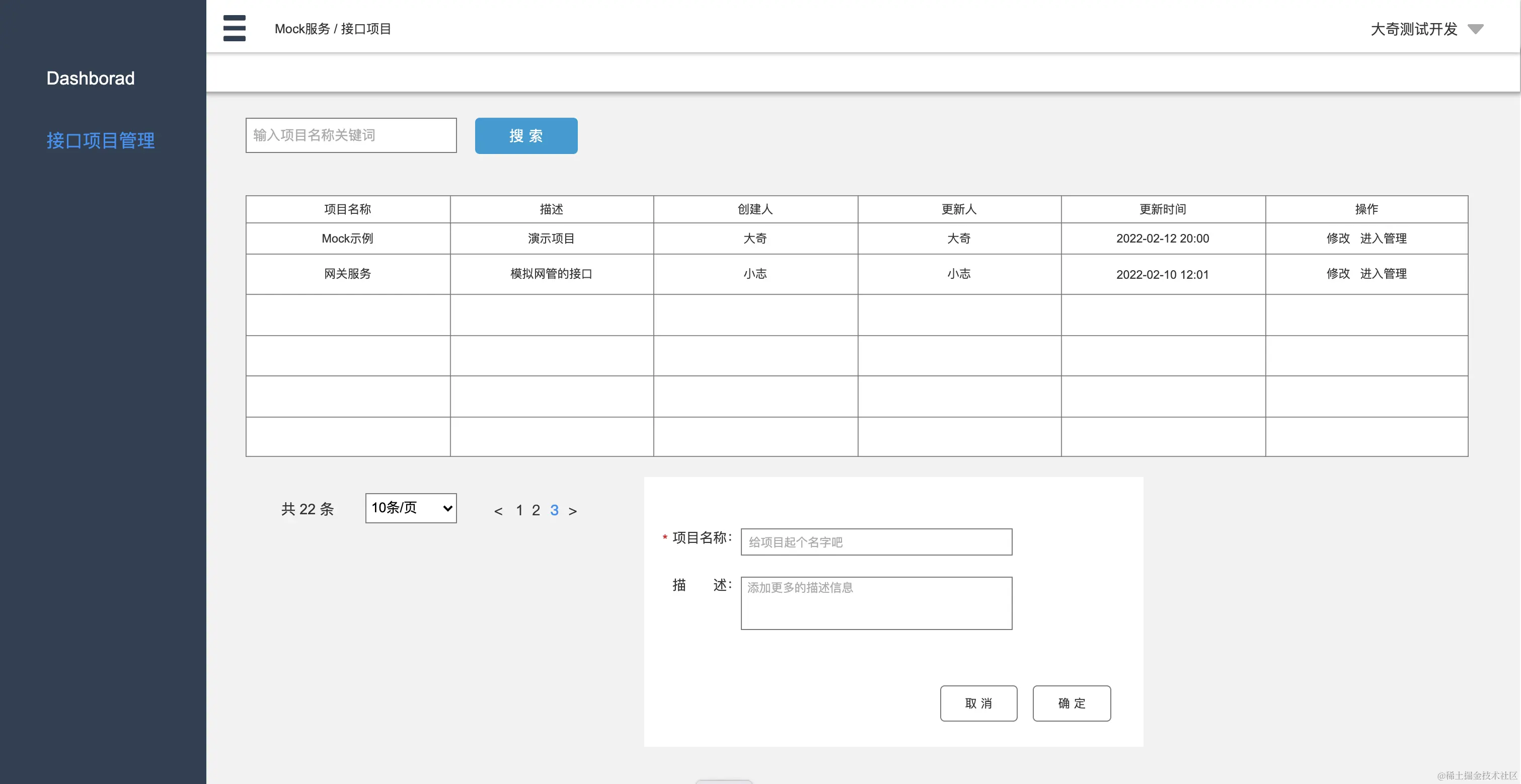 - 添加和编辑对话包含项目名称(必填)和描述,确定提交成功后进列表刷新