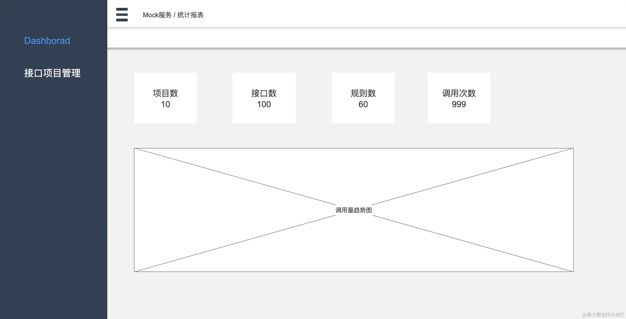 接口相关的数据统计,初步计划展示一些概要汇总,以及调用的趋势图,这里趋势的统计需要依赖后段服务做个请求日志存留,详细界面和数据内容做到的时候在详细说明,此处仅做个概要原型预览。