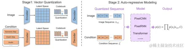 相比于基于GAN和扩散模型的方法,自回归模型方法能够更加自然的处理多模态数据,以及利用目前流行的Transformer模型。自回归方法一般先学习一个向量量化编码器将图片离散地表示为token序列,然后自回归式地建模token的分布。由于文本和语音等数据都能表示为token并作为自回归建模的条件,因此各种多模态图片合成与编辑任务都能统一到一个框架当中。