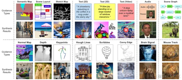 在第二章节,根据引导图片合成与编辑的数据模态,该综述论文介绍了比较常用的视觉引导,文字引导,语音引导,还有近期DragGAN提出的控制点引导等,并且介绍了相应模态数据的处理方法。