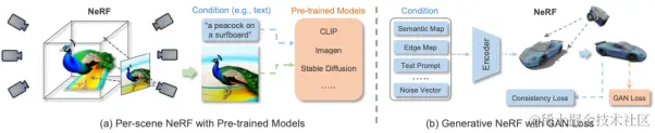 以上方法主要聚焦于2D图像的多模态合成与编辑。近期随着神经辐射场(NeRF)的迅速发展,3D感知的多模态合成与编辑也吸引了越来越多的关注。由于需要考虑多视角一致性,3D感知的多模态合成与编辑是更具挑战性的任务。本文针对单场景优化NeRF,生成式NeRF两种方法对现有工作进行了分类与总结。
