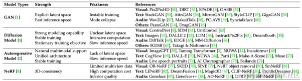 在第三章节,根据图像合成与编辑的模型框架,该论文对目前的各种方法进行了分类,包括基于GAN的方法,扩散模型方法,自回归方法,和神经辐射场(NeRF)方法。