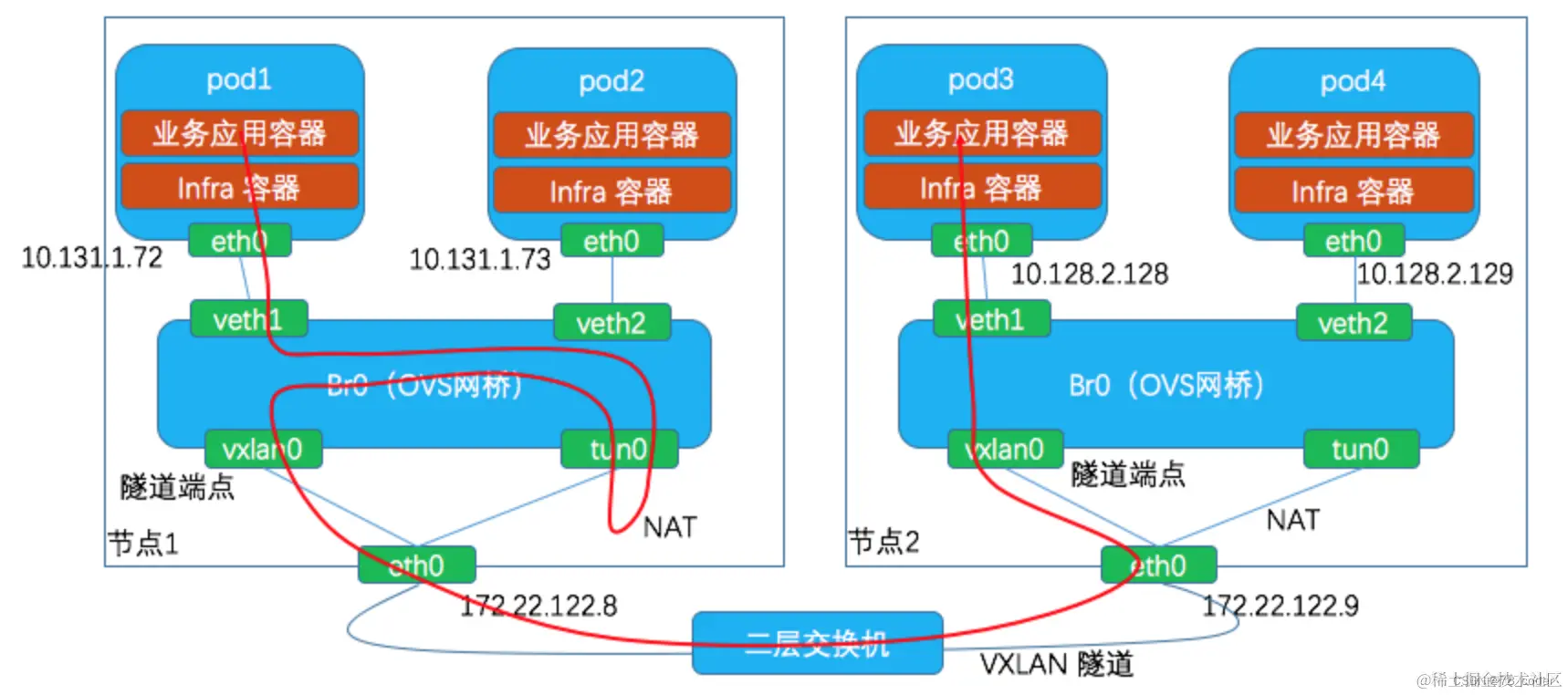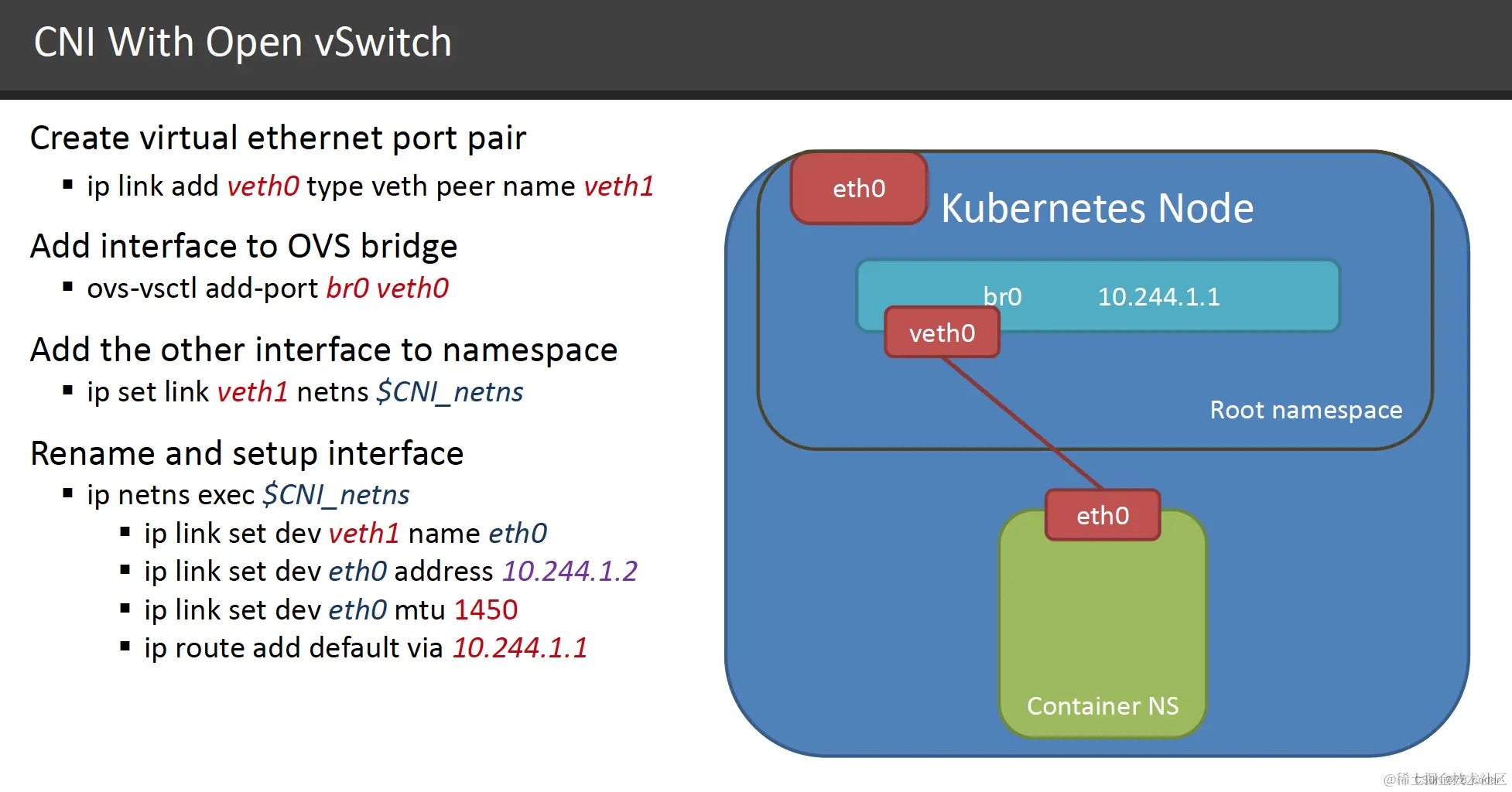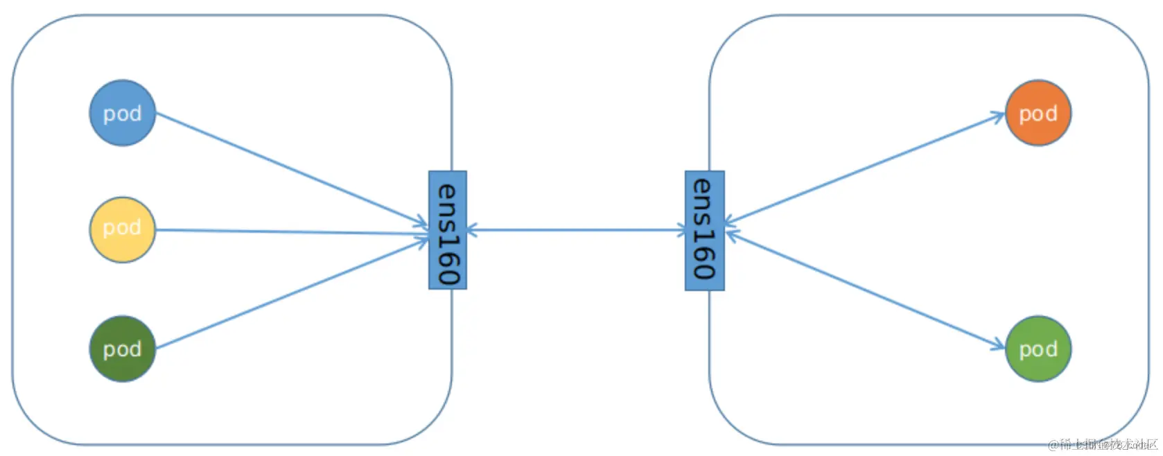 创建一个虚拟接口对veth pair,一端放在Pod中作为eth0,一端放在root ns中插在linux bridge或者是ovs bridge上,实现接口的连通。这种方式下网桥可能会带来一些额外的性能开销。