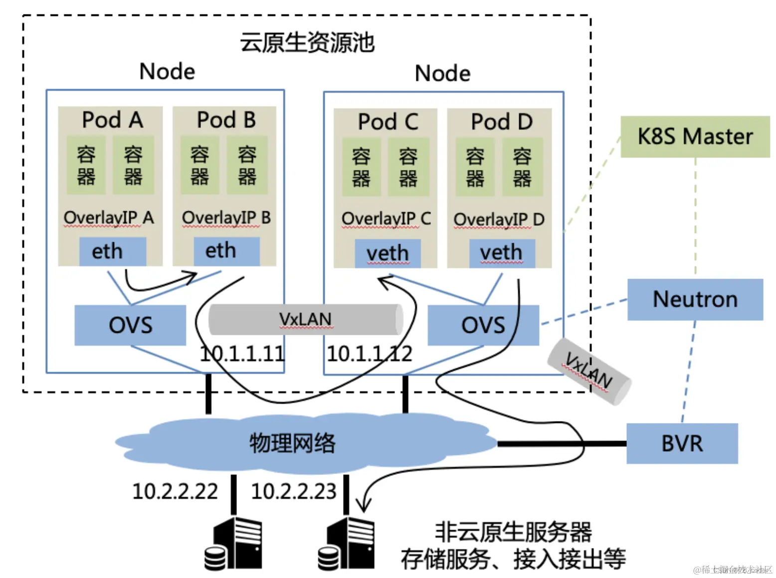 通过上面的BVR可以将PodIP暴露到IDC网络中,Neutron采取Port的FixedIP=FloatingIP的方式,这样无需做NAT对业务比较友好。