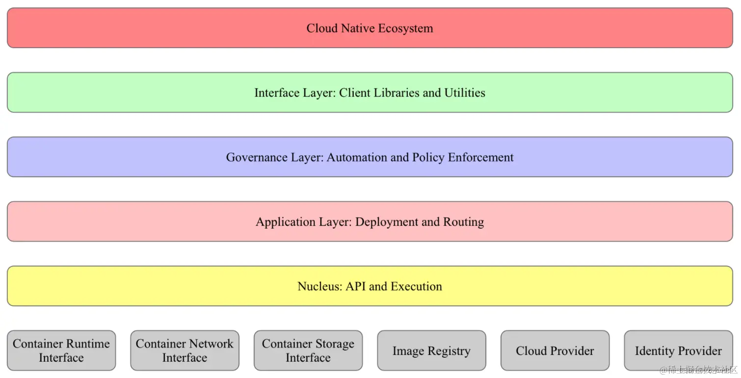 应用层:部署(无状态应用、有状态应用、批处理任务、集群应用等)和路由(服务发现、DNS解析等)、Service Mesh(部分位于应用层)