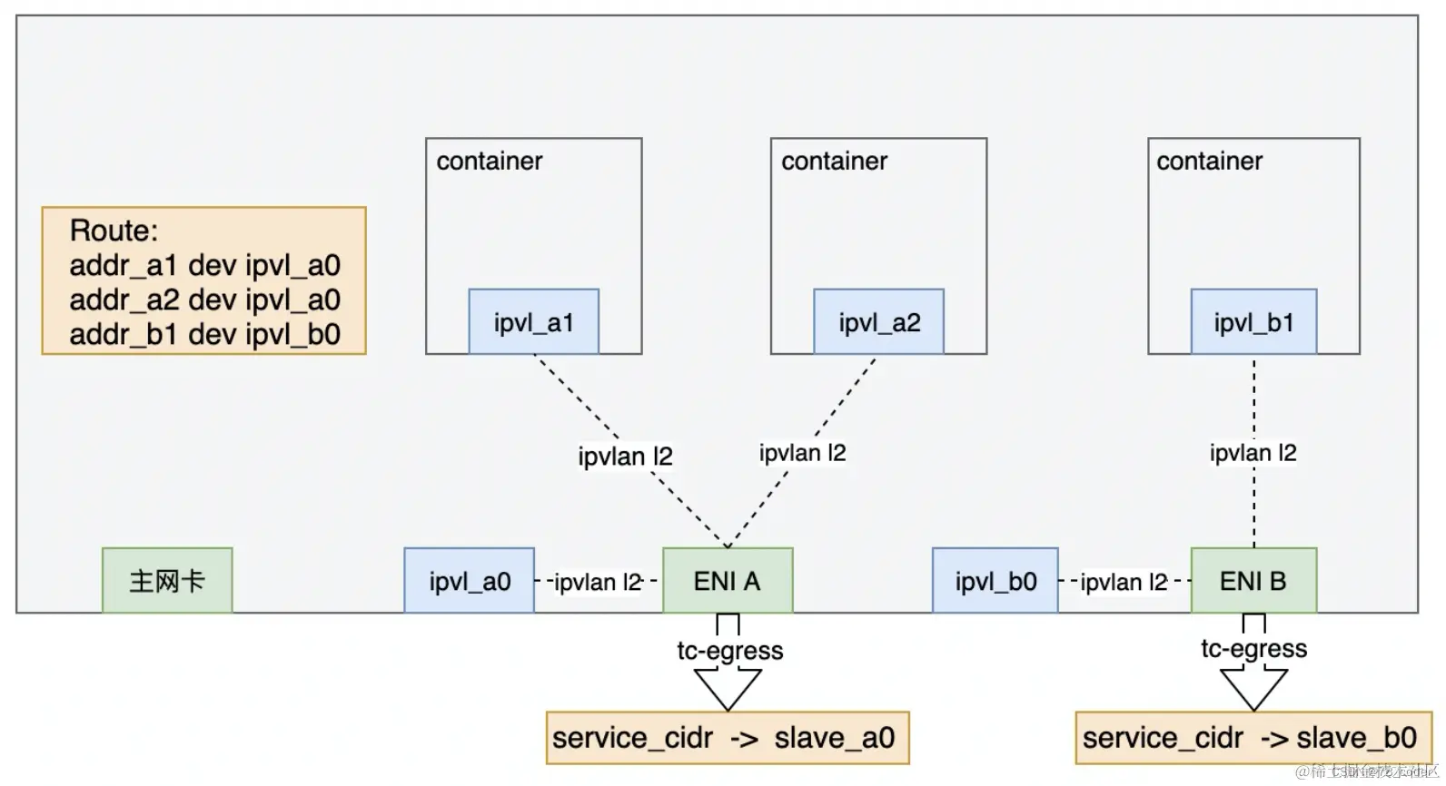 IPVLAN L2+TC,无需veth Point-to-Point,在Node的主设备上除了Pod的IPVLAN从设备之外再创建一个Node的IPVLAN从设备用于Node与Pod通信。在主设备上设置TC重定向规则,将Service流量重定向给Node的IPVLAN从设备。