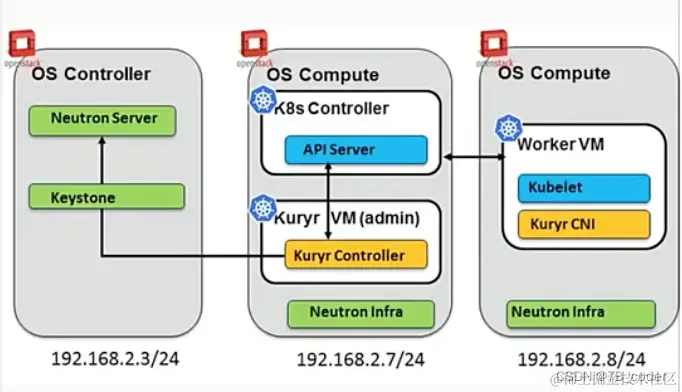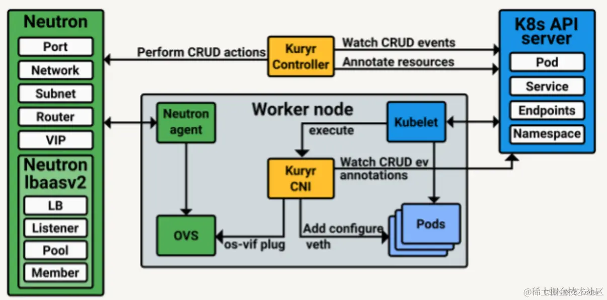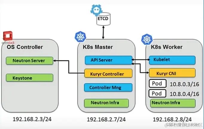 Kuryr是一个OpenStack子项目,是一个捷克语单词,意思是“信使”。顾名思义,Kuryr是连接K8S和Neutron之间的信使,通过使用K8S的CNI对接Neutron实现K8S的容器网络,借助Neutron的Overlay能力实现容器网络,在VM场景中可以避免嵌套Overlay。