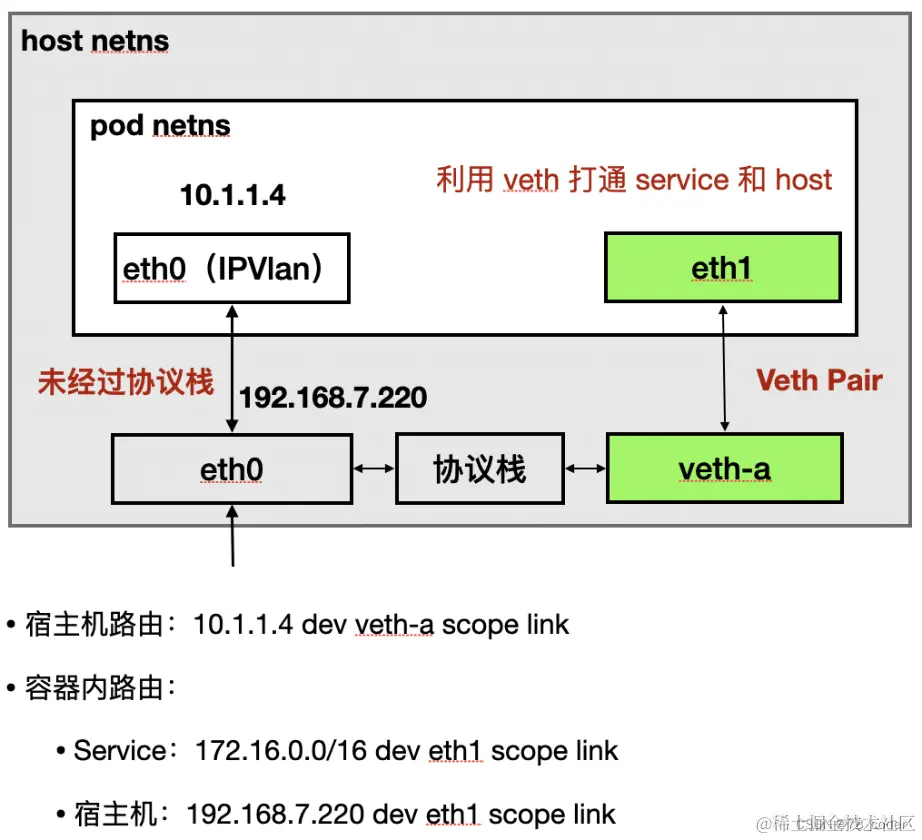 IPVLAN L3 + veth PTP(Point-to-Point),为每个Pod插入两个网卡,一个网卡是Pod的主网卡,一个网卡用来跟Node和Service通信,跟Node和Service通信的网卡上也需要配置IP地址。