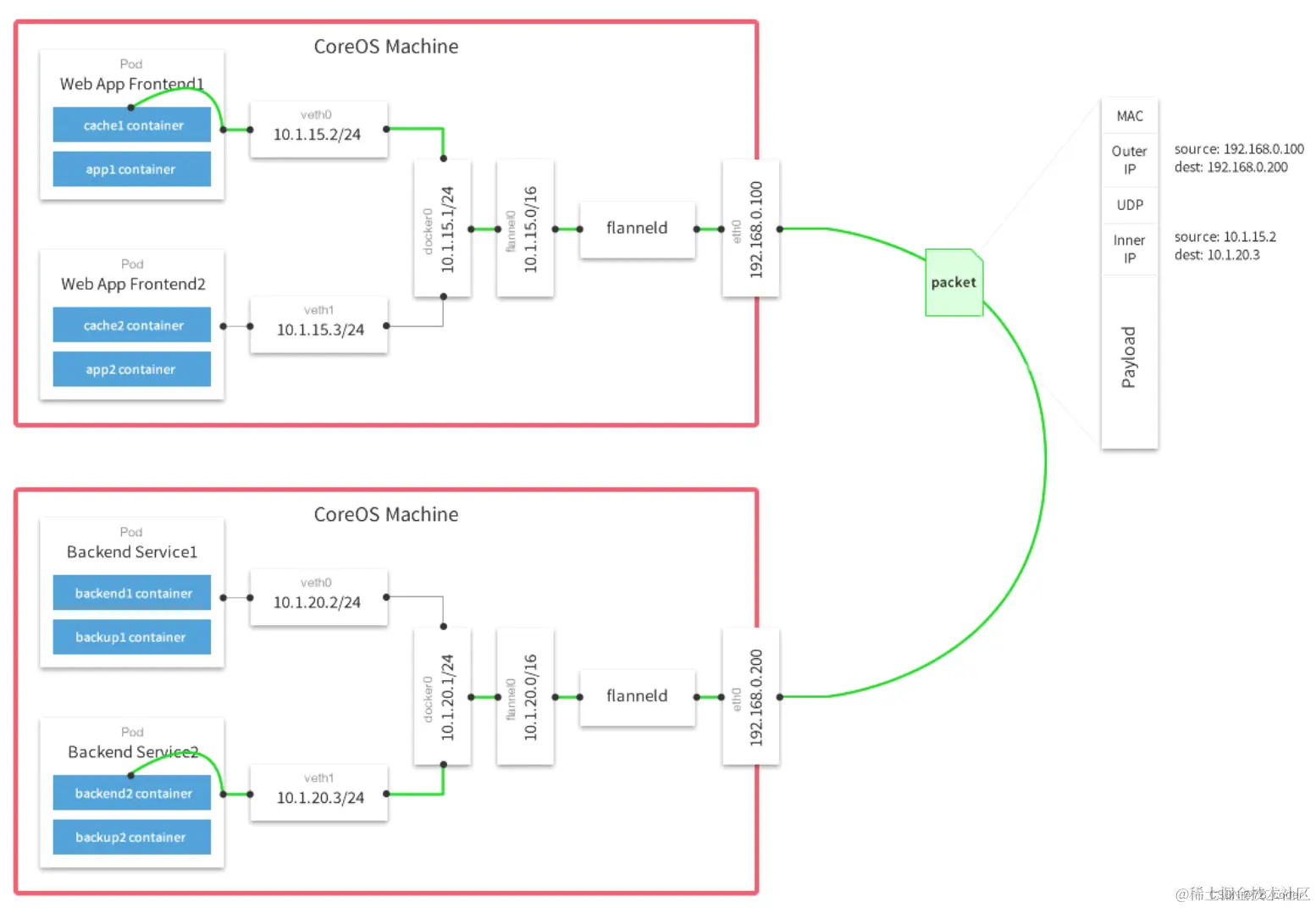 - flannel.1查看数据包的目的ip,从flanneld获得对端隧道设备的必要信息,封装数据包。