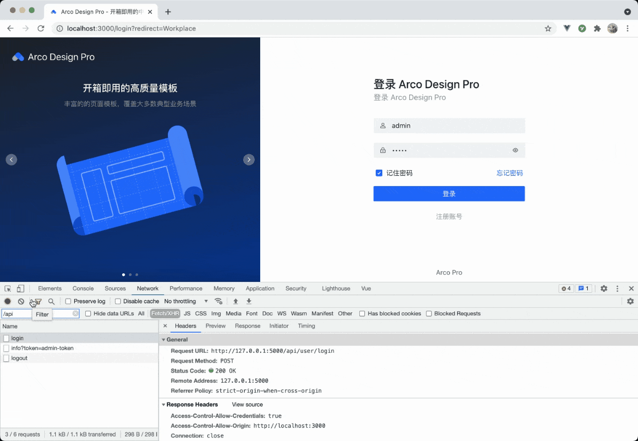 这有个内容需要注意,Acro Pro被 Mock.js 匹配并拦截的请求,因此请求接口信息不会出现在开发者工具的 network 面板中,也即意味着我们想查到登录的接口和返回值只能从项目初始化代码入手了。