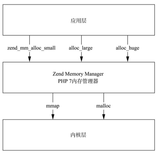 应用程序通过与 Zend MM(Zend Memory Manager)交互,来间接实现对操作系统内存的使用、屏蔽掉操作系统细节,简化了开发,并提供内存池技术,性能得到大幅提升。