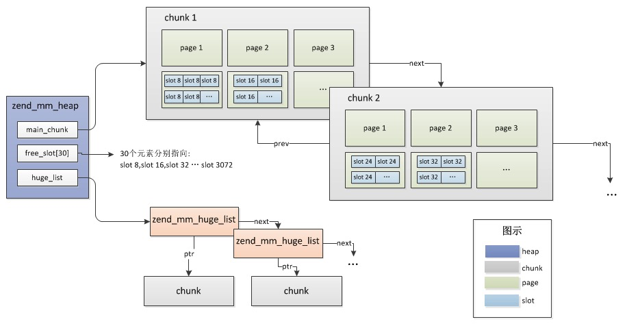 三种尺寸通过 zend_mm_heap 结构保存,三者间的关系: