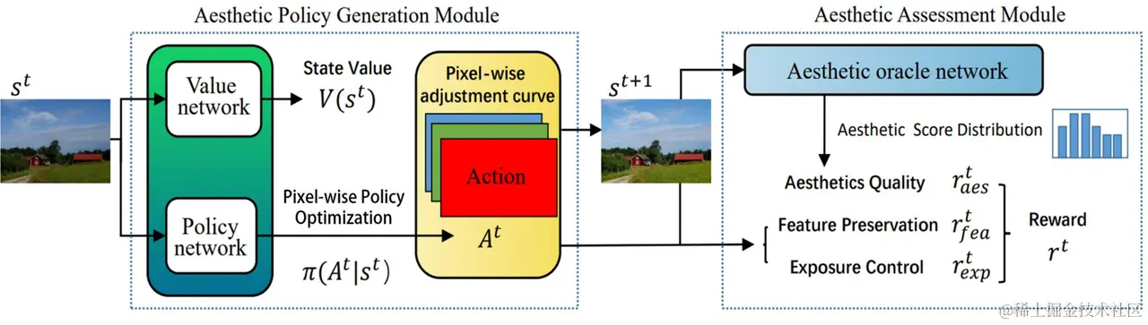 美学评估模块使用美学预测网络和一系列损失函数来构建步骤 t 的即时奖励 。 由三个互补的奖励组成,包括美学质量奖励(Aesthetics Quality Reward)、特征保留奖励(Feature Preservation Reward)和曝光控制奖励(Exposure Control Reward),以保留更好的主观视觉体验和客观评价。
