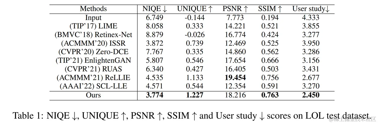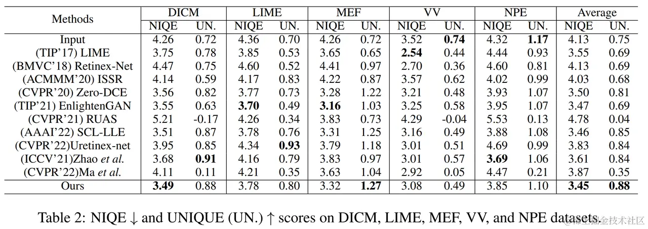 我们使用 NIQE 和 UNIQUE 作为非参考评估指标,采用峰值信噪比(PSNR,dB)和结构相似度(SSIM)作为全参考图像质量评估指标,定量地比较各种方法的性能 ,而且我们进行了人类主观调查(User study)进行比较。