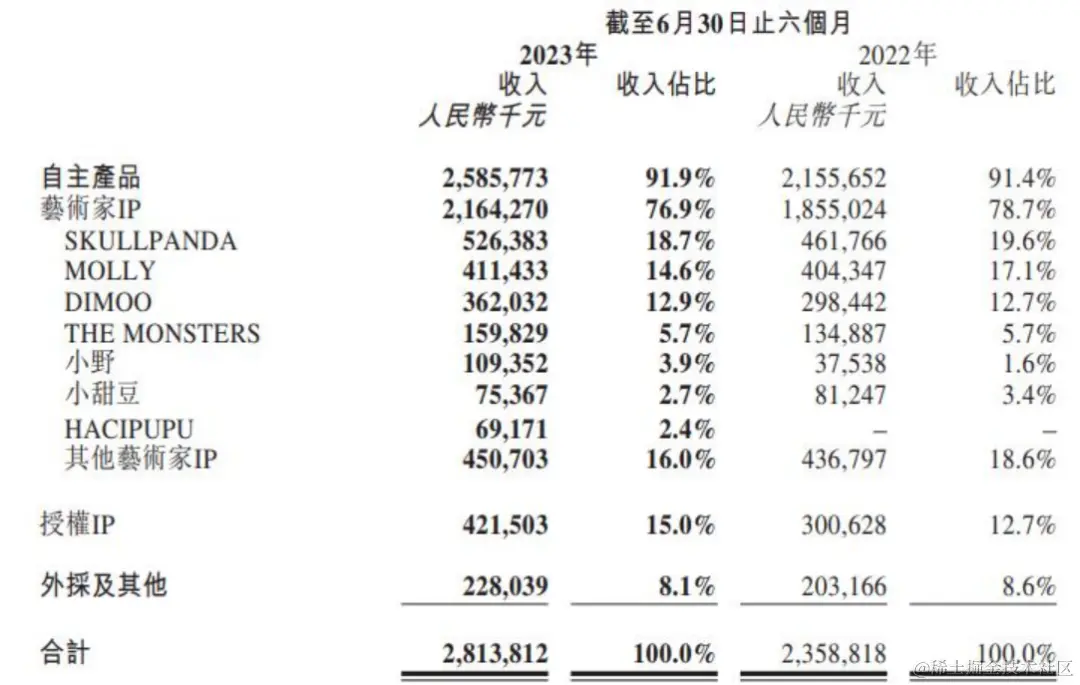 财报显示,SKULLPANDA、MOLLY和DIMOO在上半年分别实现收入5.26亿元、4.11亿元和3.62亿元,同比分别增长14.0%、1.8%和21.3%。 可以看出,经典IP依然是中坚力量,上述三款经典IP营收占46%。