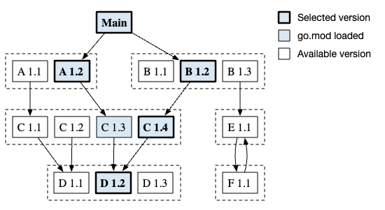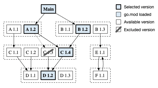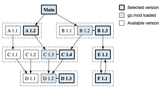 Go 使用一种称为最小版本选择 (MVS) 的算法,通过 module 的 go.mod 文件,一层层沿着依赖关系图找出符合要求的各个依赖 module 的版本,组成构建列表 build list。