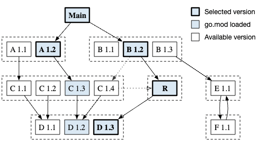 如果依赖管理中存在 replace 的情况,replace 进来的新 module 可能会有不同的依赖关系,MVS 也会把这种情况考虑进去,如图,原本的 C1.4 版本被 replace 成了 R,而 R 依赖 D1.3,这样综合下来最后的构建列表结果就是 A 1.2、B 1.2、R 和 D 1.3