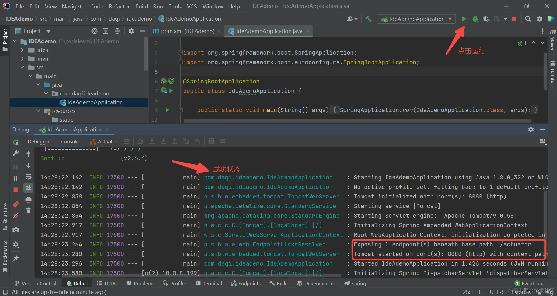 依赖全部初始化完成后,其实暂时不需要编写任何代码就能运行,直接点击IDEA的工具栏Run或Debug按钮。