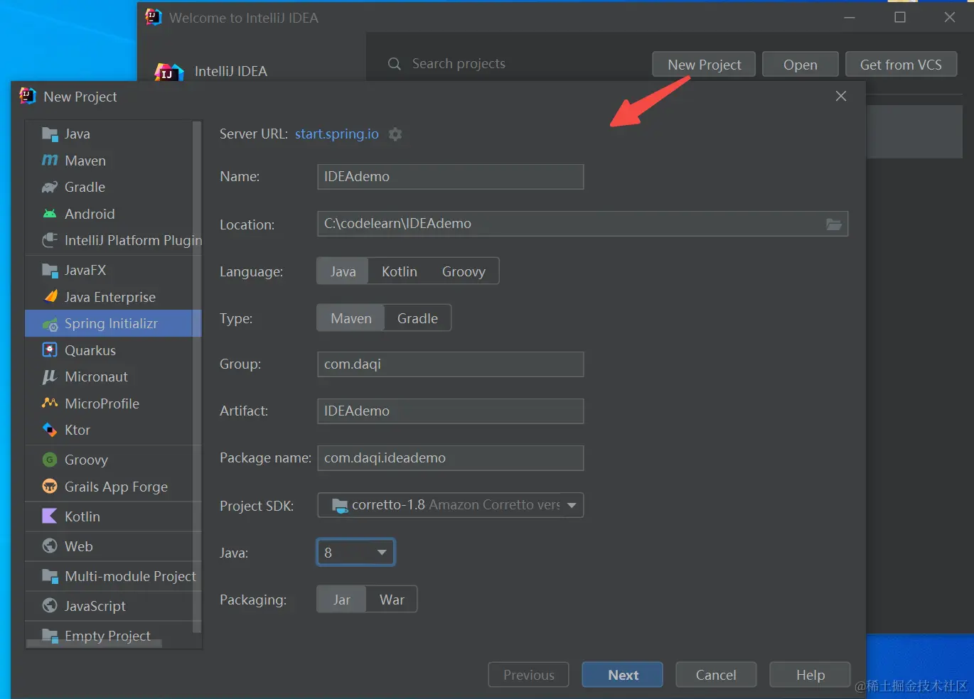 新建一个项目(如果IDEA是最新版,请在上一个项目中 File -> Close project 才会进入到项目管理窗口),New Project -> Spring Initializr 选项内容如图所示。